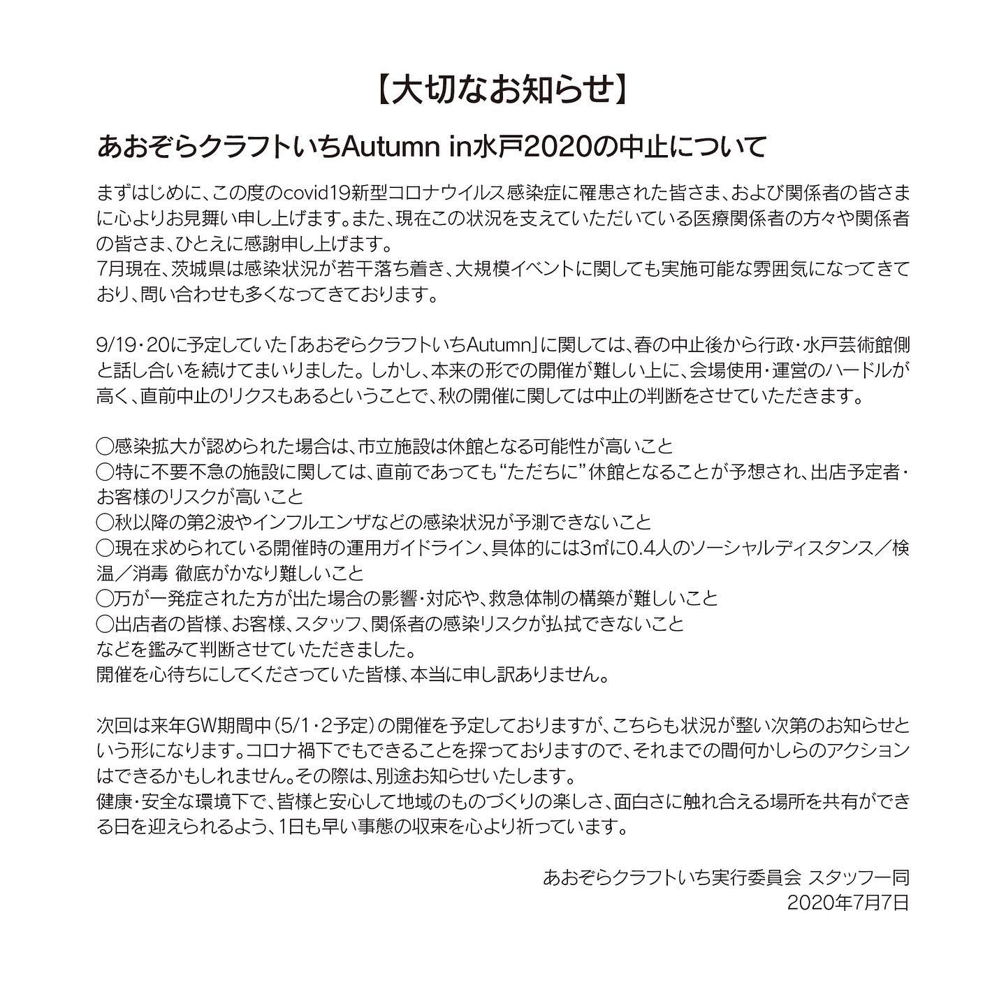 9/19・20に予定していた「あおぞらクラフトいちAutumn」に関しては、春の中止後から行政・水戸芸術館側と話し合いを続けてまいりました。 しかし、本来の形での開催が難しい上に、会場使用・運営のハードルが高く、直前中止のリクスもあるということで、秋の開催に関しては中止の判断をさせていただきます。