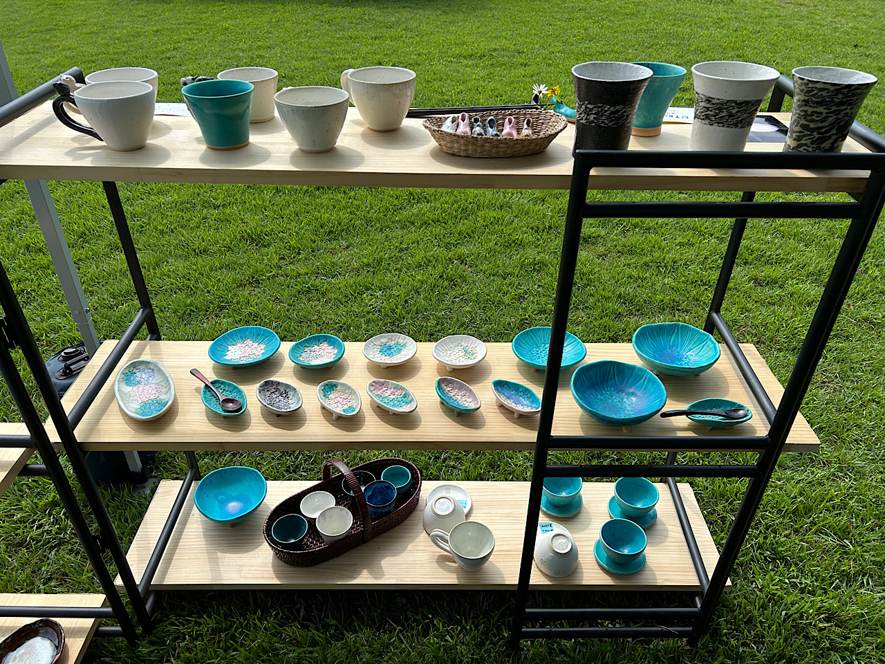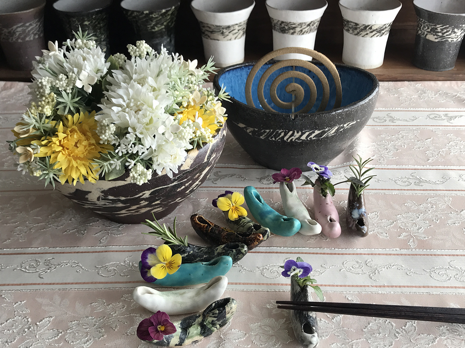花器にもなる蚊遣り・一輪挿し・ぐい呑み・クリーミィに泡立つビアカップなど遊び心ある陶器たちが、皆さまの暮らしにそっと溶け込んでいけたら嬉しいです。いつかはと思っていた故郷に近い場所での出店どうぞよろしくお願いいたします。