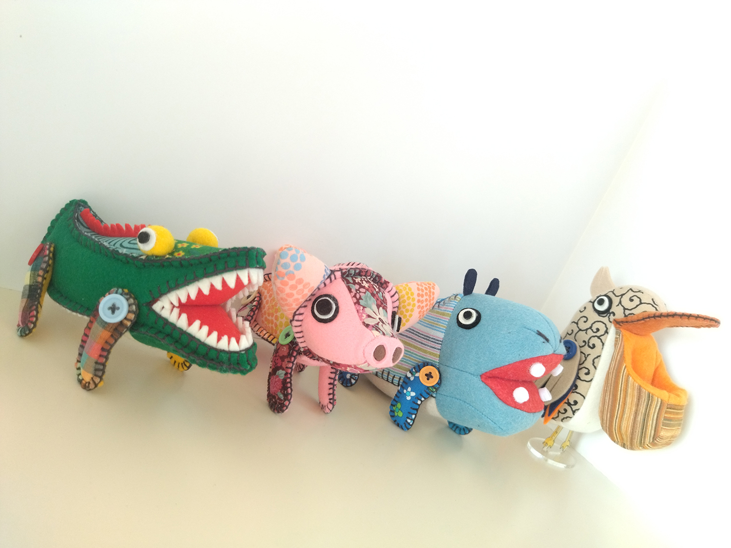 作品は主にフェルト生地と布を組み合わて縫合する ブランケットステッチが特徴のオリジナルのぬいぐるみです。