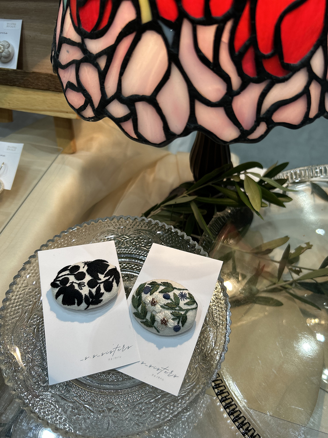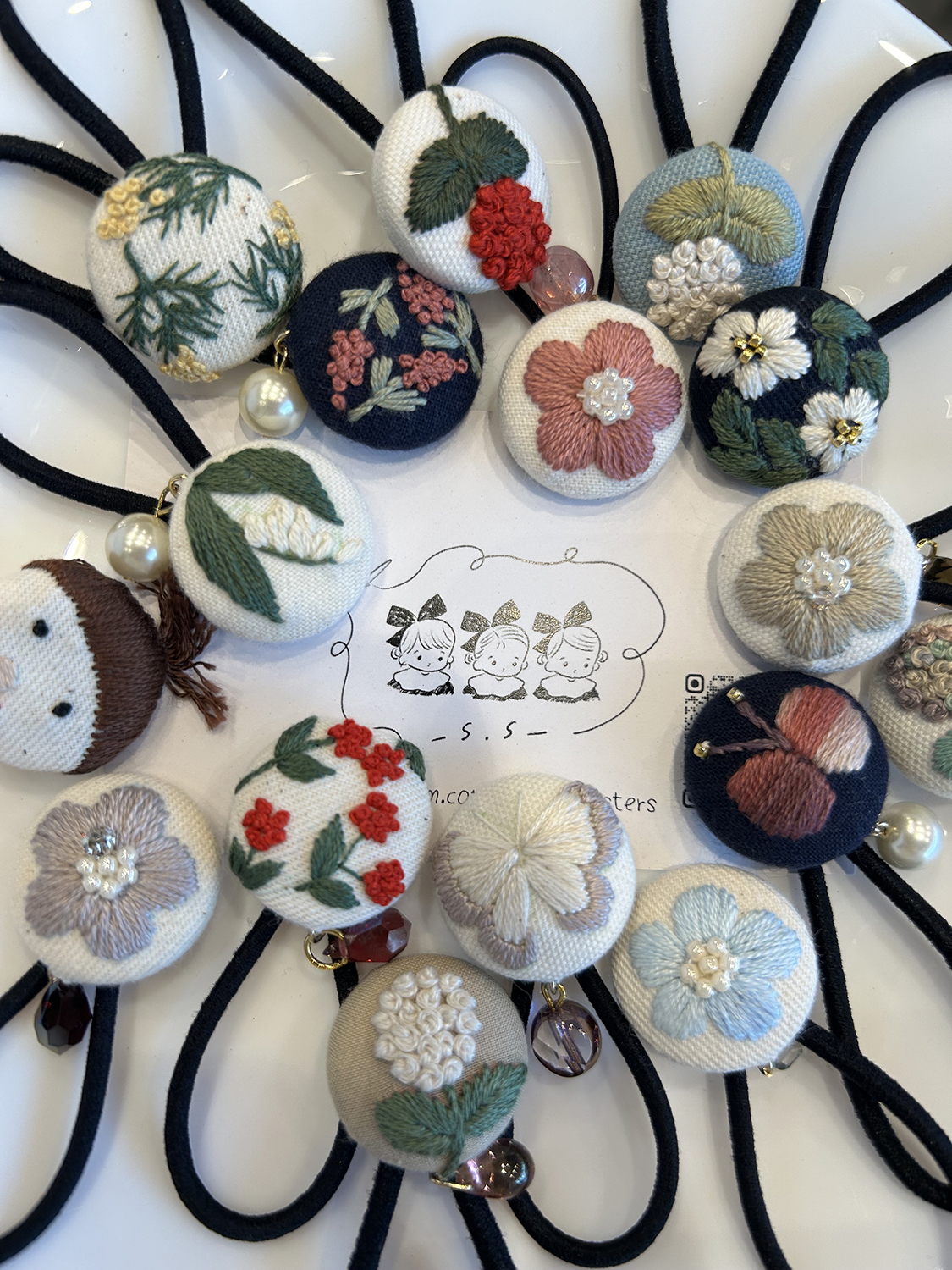 _s.s_です。私たちは草花や自然をモチーフに、ひと針ひと針手刺繍のアクセサリーを作っています。