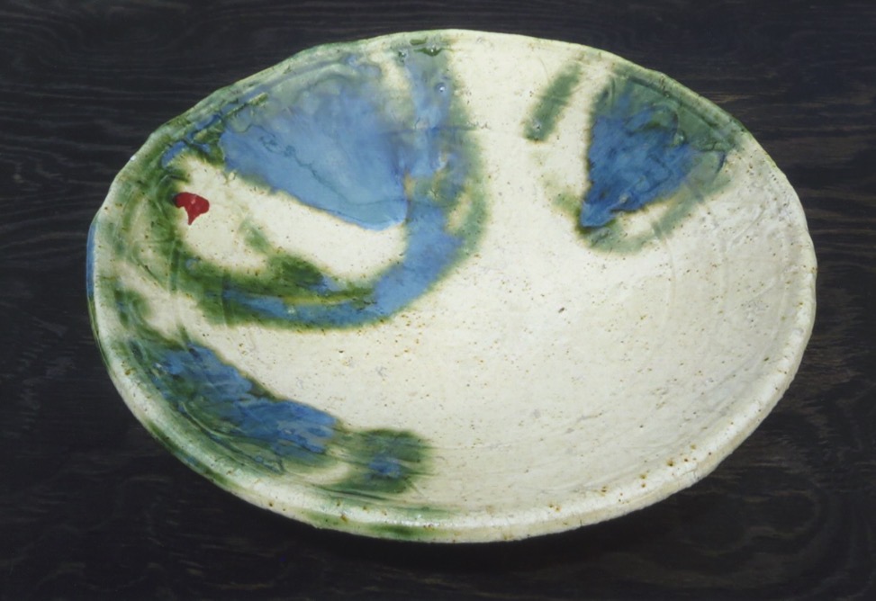 また、大胆な土の模様が特徴の練込技法と、オリジナル織部釉を組み合わせた器も作っています。