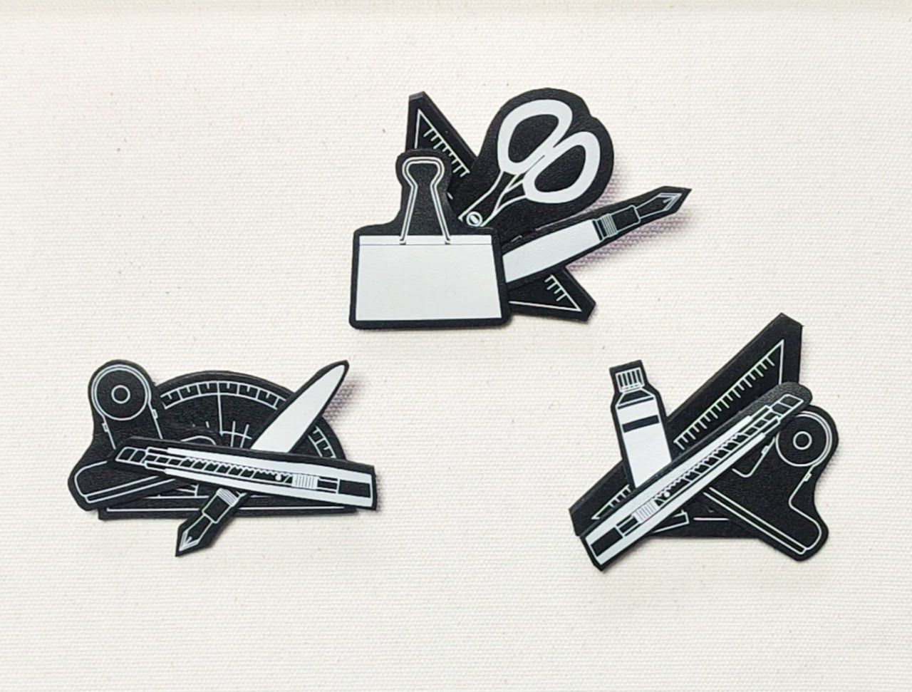 文房具や洗濯表示、バッグクロージャーなどをモチーフに経年変化を楽しめるスパイスの効いて作品を展開しています。