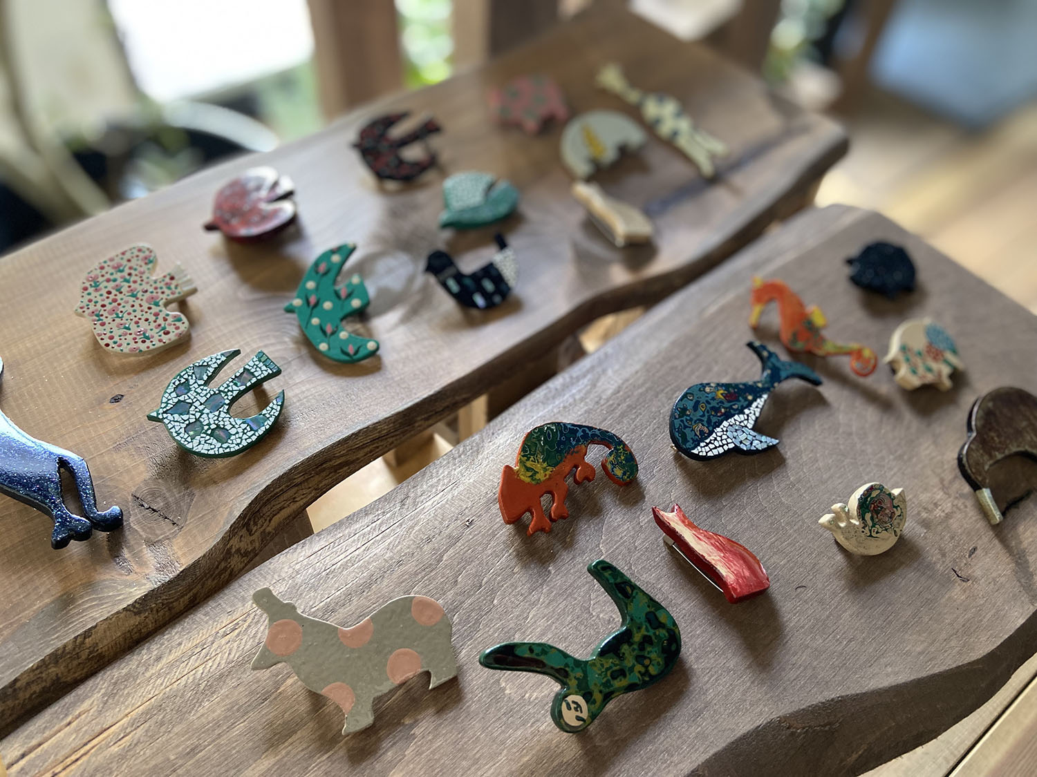 素材は主に置物は水性樹脂(Jesmonite)、ブローチなどには木材を使用しています。