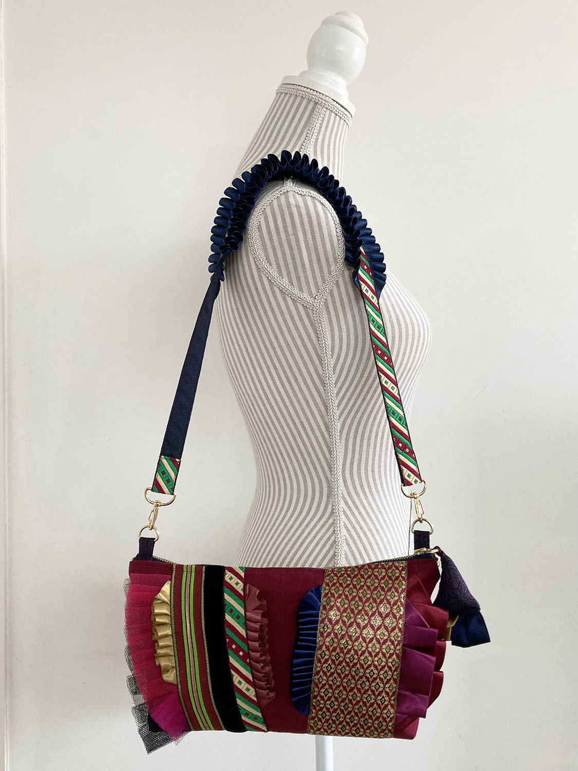 リボンをふんだんに使い仕上げたキュートなバッグ。