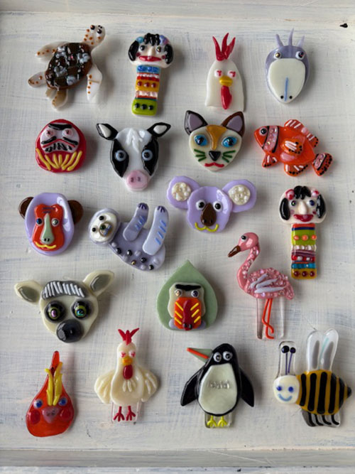 ポップでシュールなオブジェやブローチ、小さな板絵等がございます。