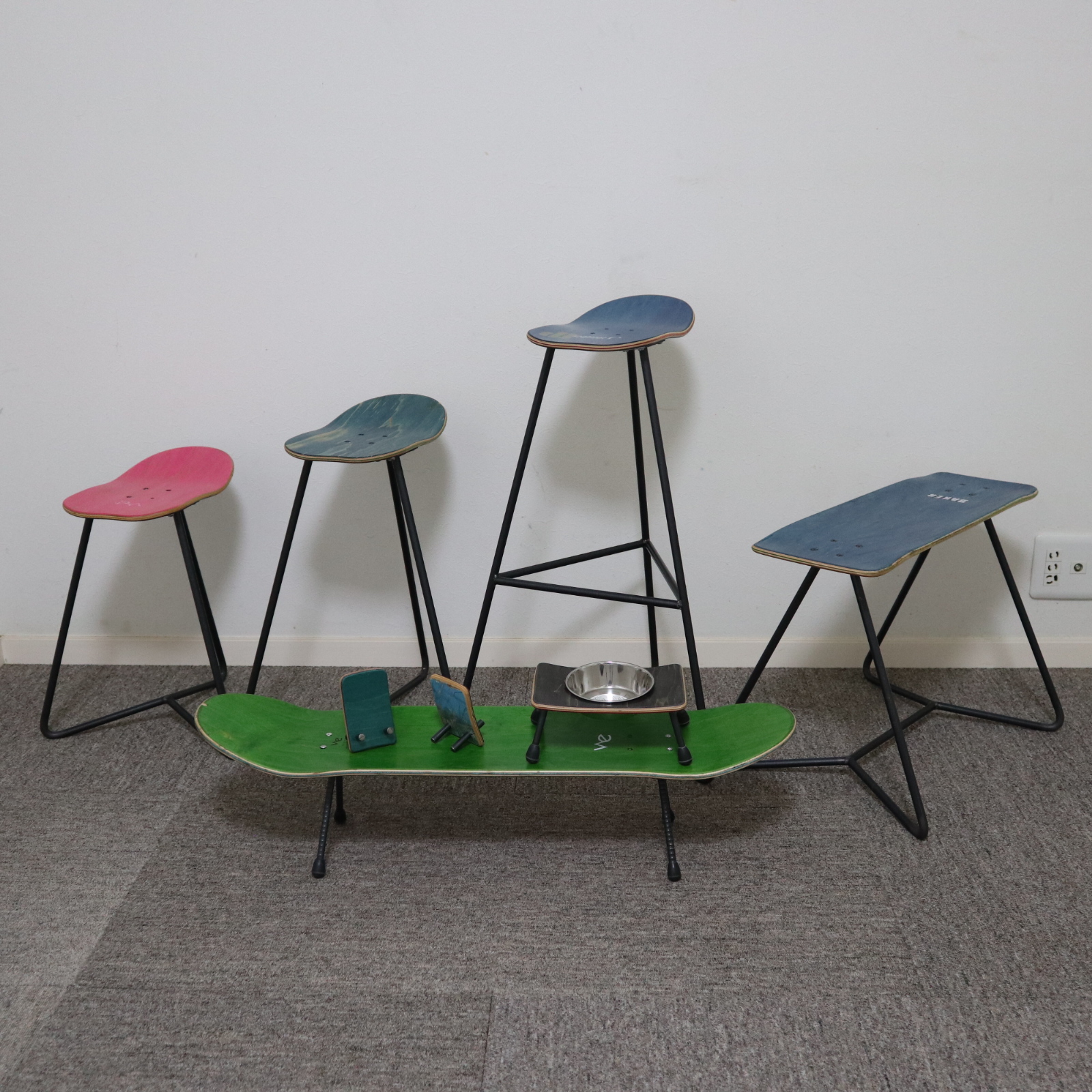 スケートボードの廃デッキを使用したスツールやスマホスタンドなどは、