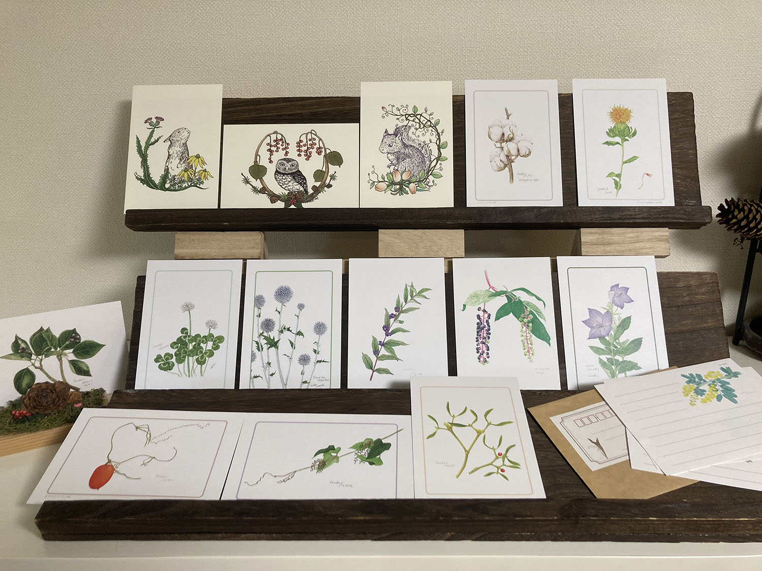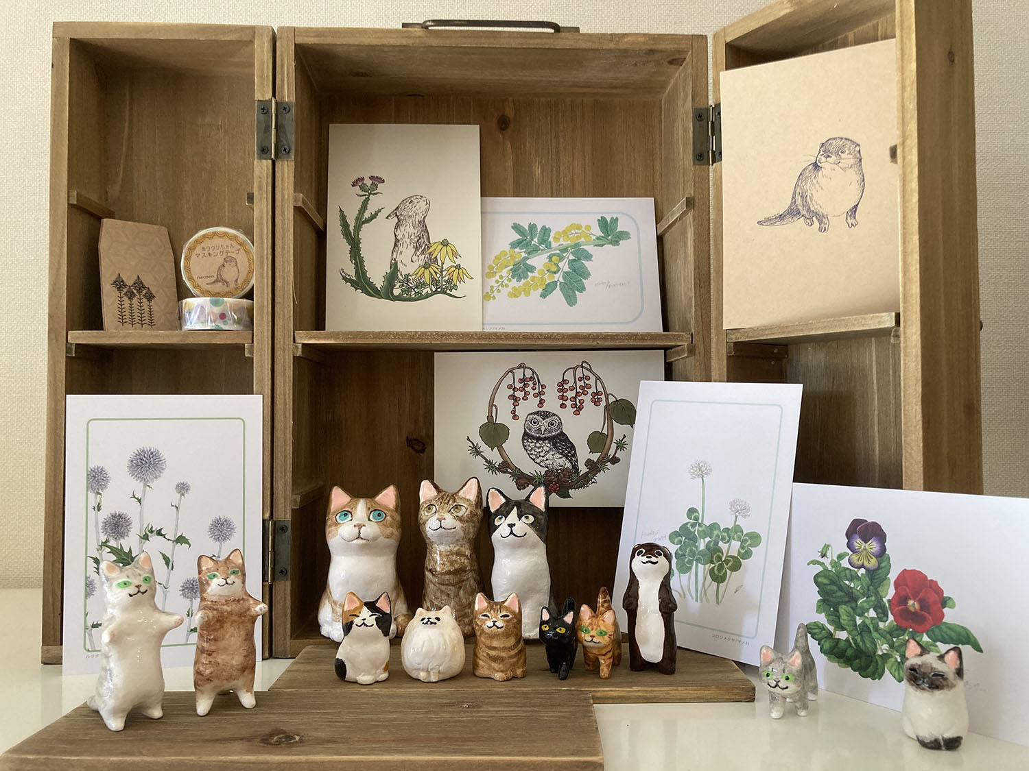 水彩の植物画(ボタニカルアート)と動物のペン画をポストカードに仕立て、樹脂粘土でどうぶつのオブジェを作っています。1体1体、形を作って色を塗って、お手元に届く瞬間を想像しながら仕上げています。