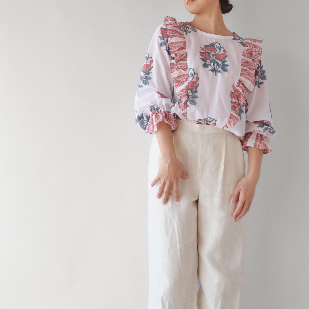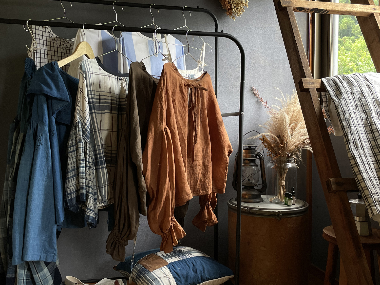 「ゆったりとしながらも、素敵な佇まいの服」をテーマに、綿やリネンなどの天然素材、そして選び抜いた”心弾む”柄の生地で服作りをしています。