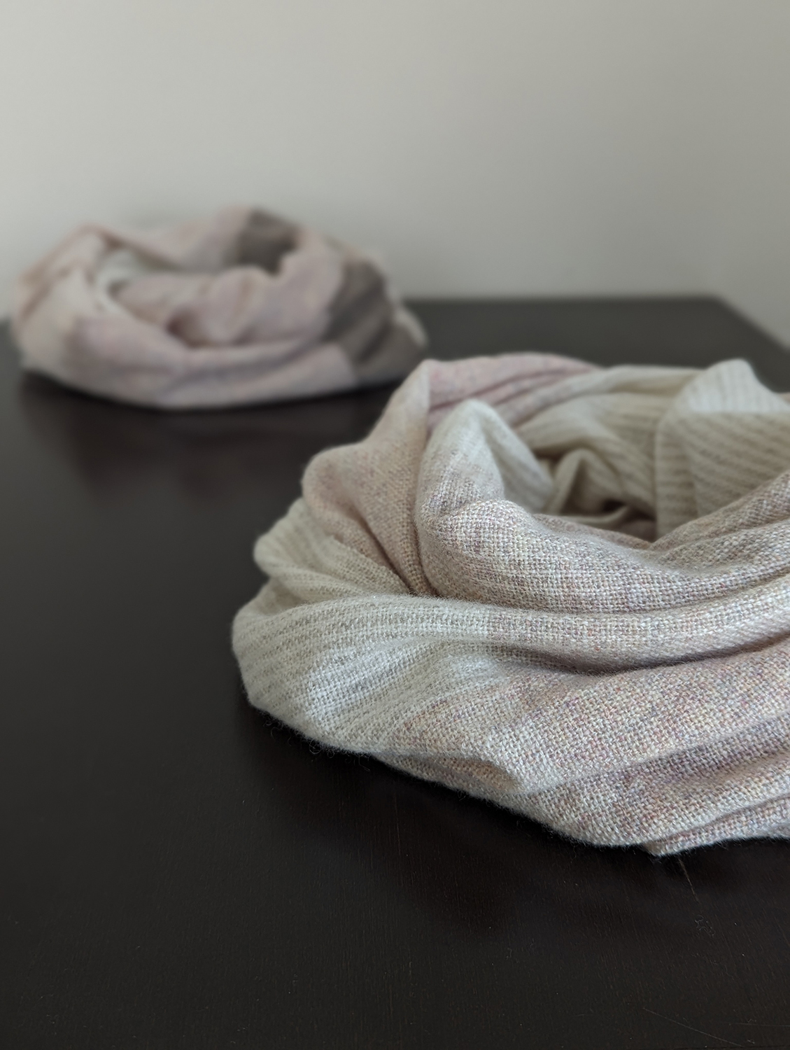 手織りしたカシミヤを「輪っか」に仕立て、どなたでも簡単に巻ける優しい肌触りのスヌード、ネックウォーマーを制作しています。