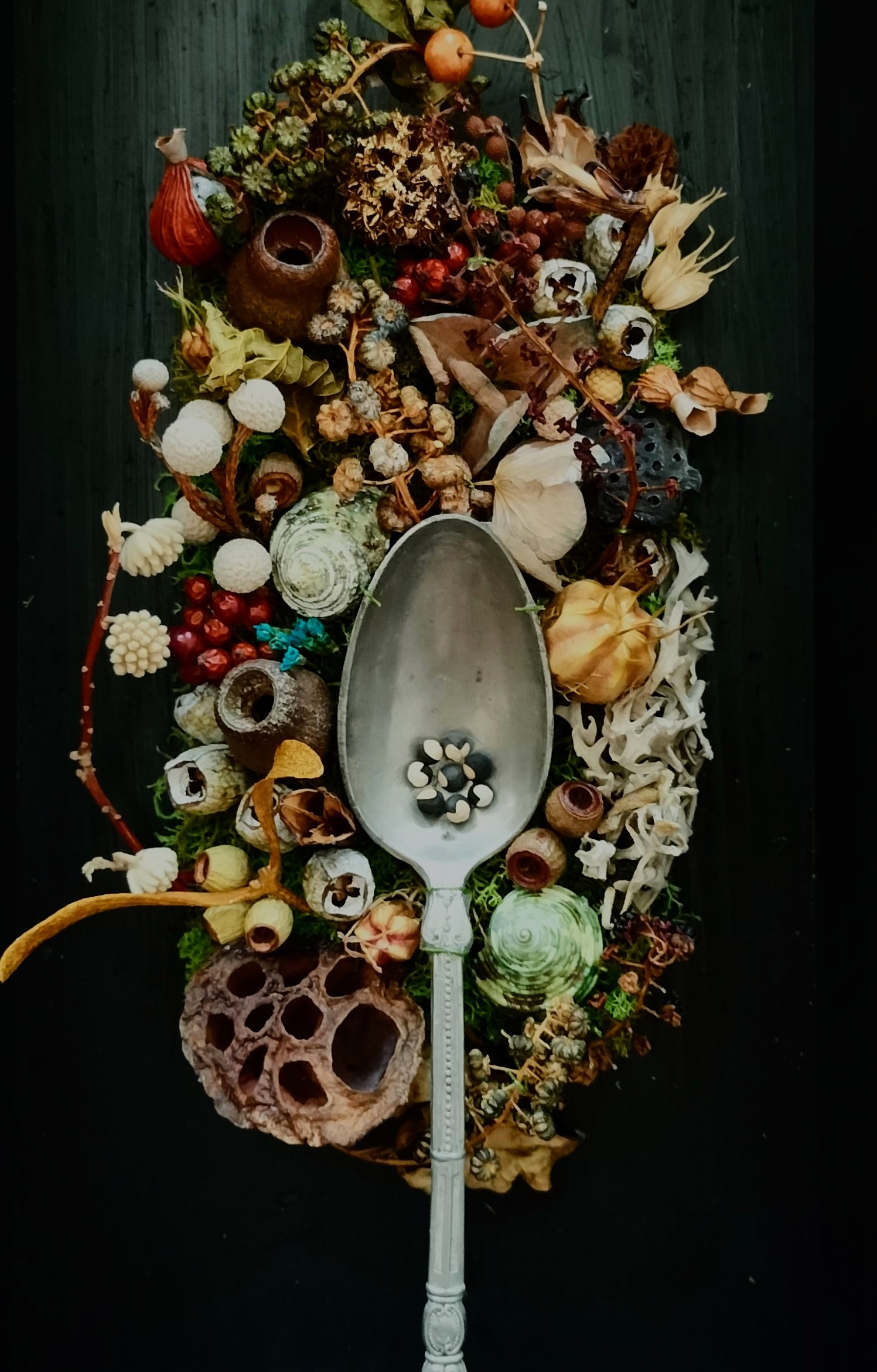 ドライフラワーを中心にスプーンやフォーク、ガラス瓶などのアンティークパーツ、