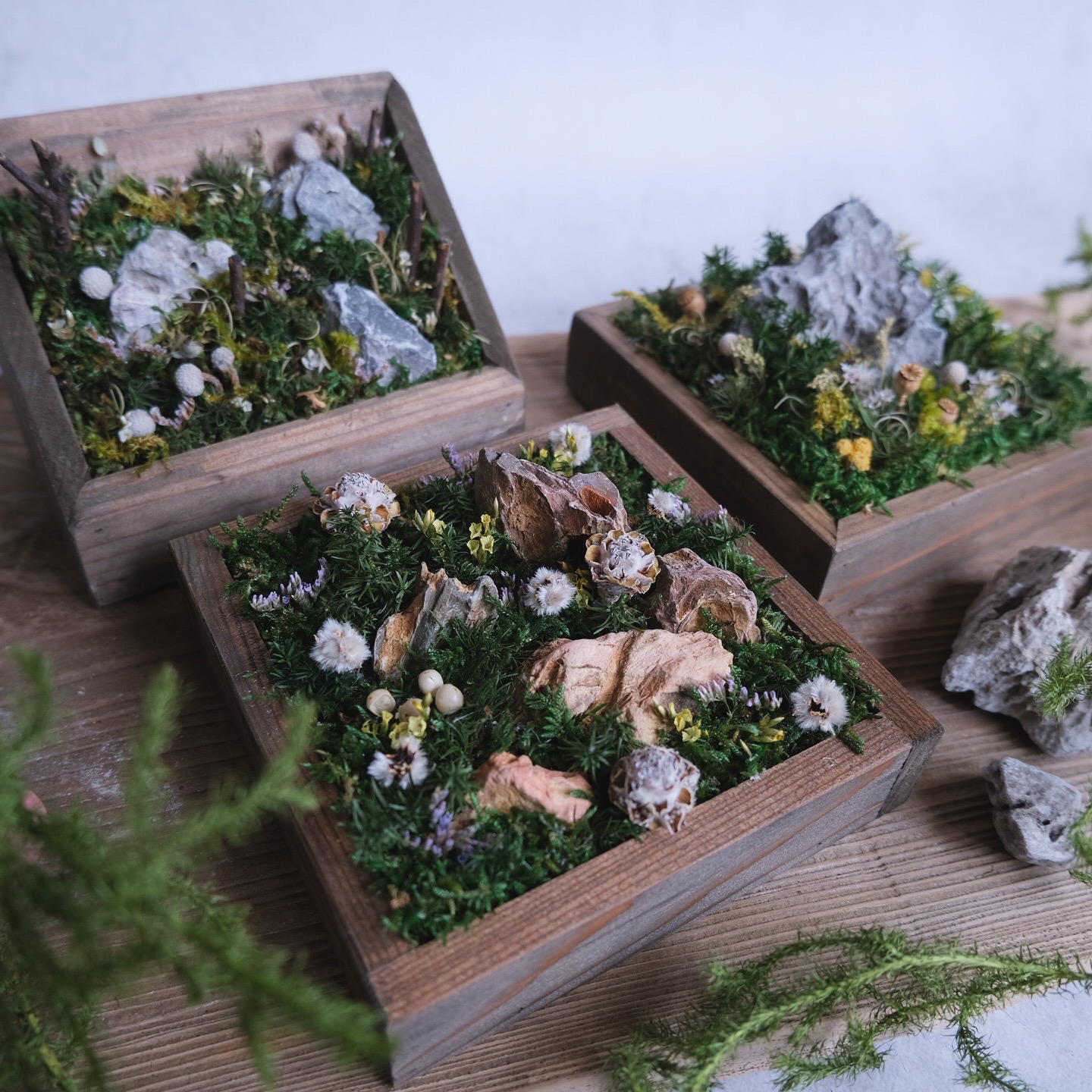貝殻や鳥の羽根など、身近にある色々な物を混ぜ合わせフレームやガラスドームなどの